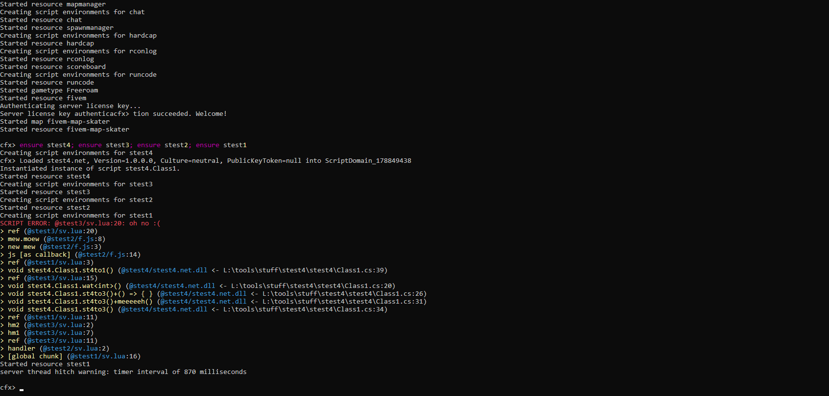 This stack trace goes on for around 3-4 times the displayed length, and is generally.. a big mess. You can tell that some resource code is running, like @stest3/sv.lua:20, f.js:8 and @stest1/sv.lua, but everything else that is shown is just noise.